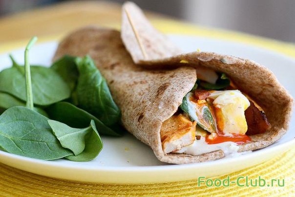 Курицу с соусом выкладываем на лаваш или кукурузные лепешки, добавляем болгарский сладкий перец, нарезанный на полоски, пару кусочков сыра. Лаваш или лепешку сворачиваем рулетом. Каждую порцию украшаем кусочками сладкого болгарского перца и листьями салата, нарезанными на полоски. Готово!