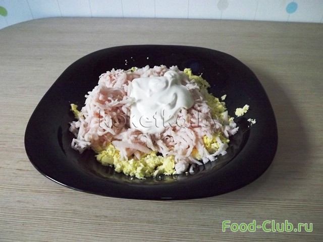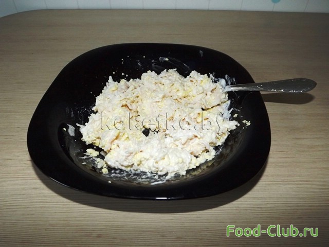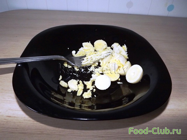 4. Приступаем к приготовлению начинки, вилкой разминаем желтки.