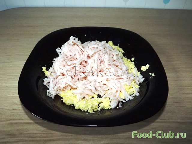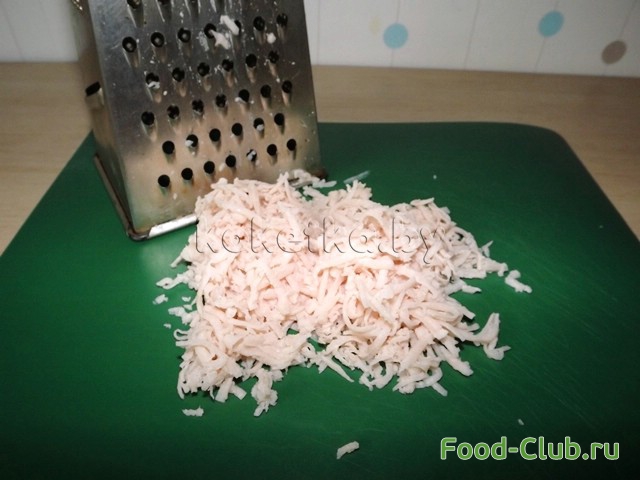 2. Пока варятся яйца, для начинки на крупную терку трем ветчину.
