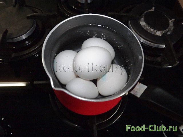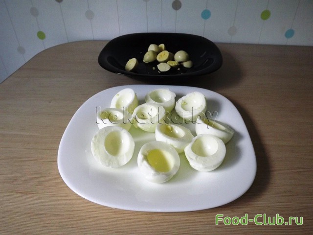 3. Яйца остужаем, чистим, разрезаем их пополам. Желтки вынимаем.
