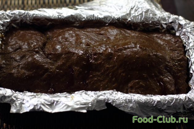 6. Выпекаем массу на водяной бане около 2-х часов, пока температура внутри паштета не достигнет 68-70 градусов. При прокалывании паштета должен вытекать прозрачный сок.