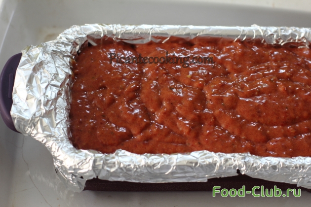 5. Форму для паштета застилаем фольгой и перекладываем массу в форму. Ставим форму с паштетом в глубокую жаропрочную посуду, заливаем водой и ставим все это в разогретую духовку.