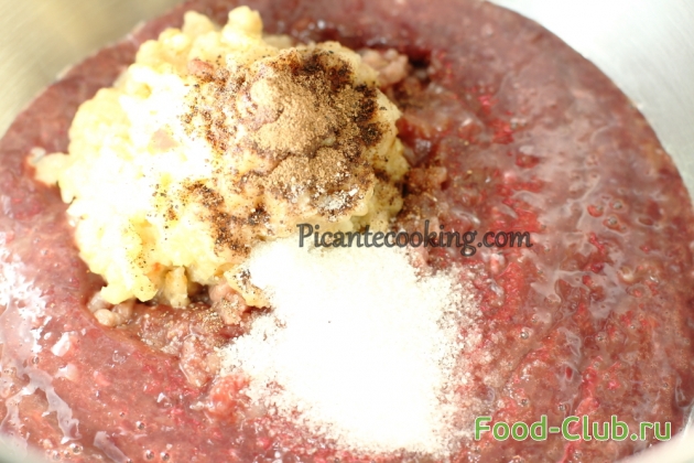 3. Через 24 часа молоко с печени сливаем, печень обсуживаем бумажным полотенцем и вместе со свиным, куриным мясом и луком измельчаем в мясорубке. Добавляем в фарш специи, перемешиваем и повторно пропускаем всю массу через мясорубку.