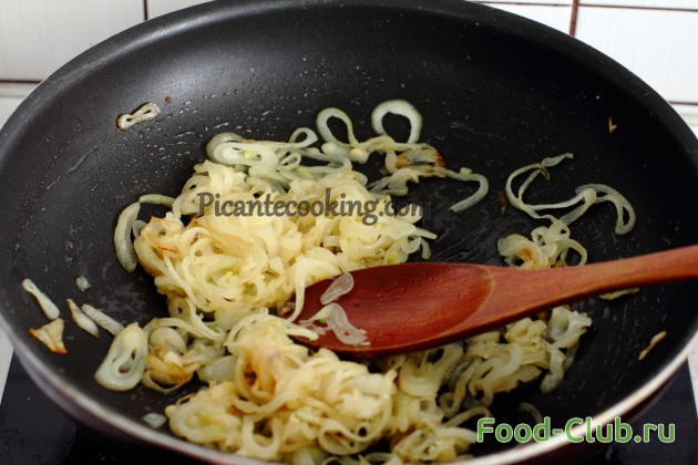 2. В небольшой сковороде на среднем огне на сливочном масле обжариваем лук до мягкости, снимаем с огня и остужаем.