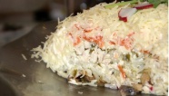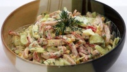 3. Хорошенько перемешиваем все ингредиенты с майонезом, затем выдавливаем чеснок и снова перемешиваем. Украшаем морковью по-корейски.