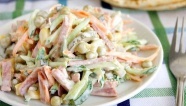 Для начала залейте чернослив кипятком и оставьте на 20 минут, затем слейте воду и нарежьте чернослив средними кубиками. Мелко нарежьте картофель, кубиками нарежьте мясо. Морковь и свеклу натрите на крупной терке. Нарежьте яйца соломкой. Натрите сыр на мелкой терке. Измельчите орехи в блендере. Лук порежьте брусками.Теперь соберите салат в такой последовательности: