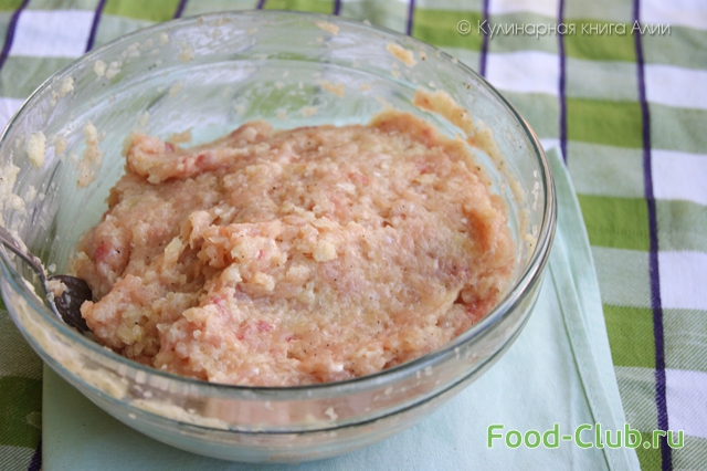 В куриный фарш добавьте лук, соль и перец по вкусу. Тщательно перемешайте до однородности. -