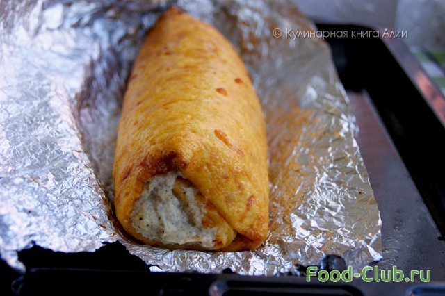 По всей поверхности равномерно распределите фарш и аккуратно сверните рулет. Полученный рулет заверните в фольгу и выложите на противень. -