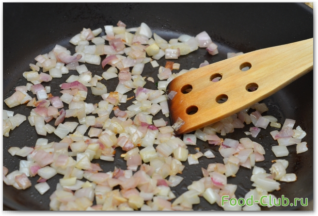 4. В небольшом количестве оливкового масла обжариваем до румяности лук.