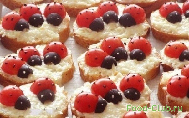 4.Теперь украсим бутерброды: Разрежьте помидоры черри пополам, а маслины- на 4 части (пополам и снова пополам). Несколько маслин измельчите в крошку. Выложите на будетброд кусочек помидорки, приставьте к нему кусочек маслины, чтобы получилось туловище и головка. На тельце сделайте точечки из маслин, а глазки нарисуйте майонезом при помощи зубочистки.
