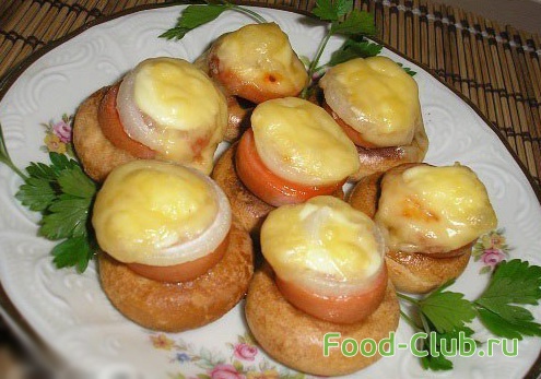 4. Затем выложите кружочек лука, немного майонеза и посыпьте тертым сыром.