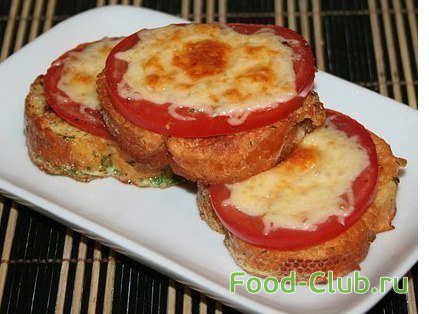 4. На готовые гренки выкладываем тонкий кружочек помидора, слегка солим и перчим, посыпаем тертым сыром.