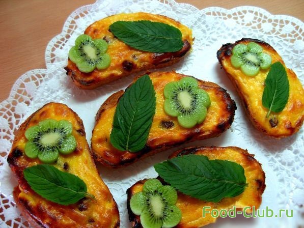 Готовые ватрушки украшаем фруктам. Блюдо готово! Получается неожиданно вкусно и нежно, а готовиться проще некуда. Приятного чаепития!