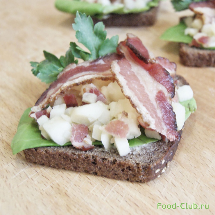 На хлеб намажьте масло, положите лист салата, сверху столовую ложку яблочно-беконной смеси. Наверх положите кусочек бекона и украсьте зеленью.