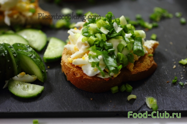 1. Для начала отварите яйца в крутую, остудите. Огурец нарежьте тоненькими кружочками. Кусочки батона нарежьте на порции и обсушите на сухой сковородке или в тостере. Порубите остуженные яйца на мелкие кубички. Нарежьте зеленый лук.