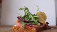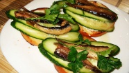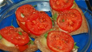 На хлеб выкладываем лук с грибами, сверху по кусочку помидора и огурца, посыпаем тертым сыром.