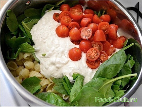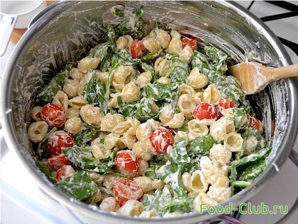 3. Готовую пасту промойте, хорошенько отцедите и, пока кастрюля еще горячая, выложите в нее пасту, томаты, шпинат и кремовый соус. Хорошенько все перемешайте.