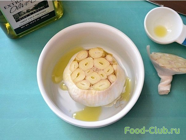 1. Для зачала подготовим чеснок. Острым ножом срежьте с головки чеснока верхушку, примерно 1 см. Переложите чеснок в маленькую мисочку и полейте оливковым маслом, а сверху накройте блюдцем. Разогрейте чеснок в микроволновке минуты две, пока он не размякнет. Тоже самое можно сделать и в духовке, но потребуется гораздо больше времени. Когда чеснок слегка остынет, выдавите и измельчите зубчики.
