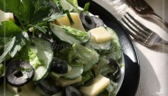3. На блюдо выложим салатные листья, аккуратно перевернем на них салатник. Украсим орешками и луком.