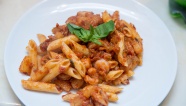 6. Отварите пасту. Выложите поверх пасты приготовленные грибы с курицей в соусе. Сразу же подавайте.