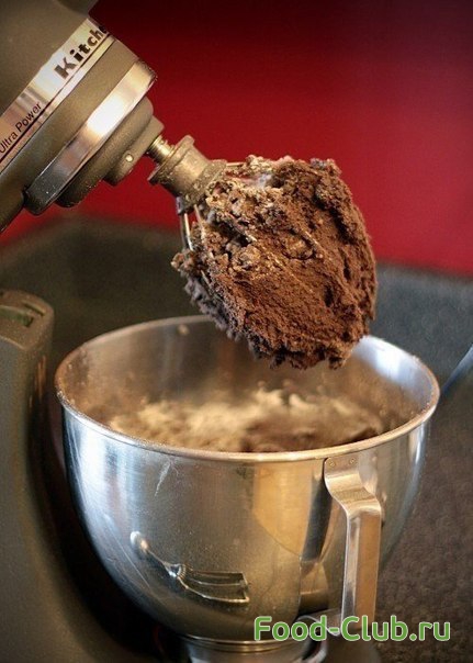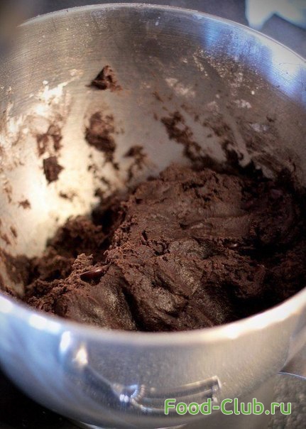 2. Постепенно добавляем в массу муку, соль, пекарский порошок т кусочки шоколада, густую массу аккуратно перемешиваем. Тесто получается очень густым, поэтому вымешиваем его руками.