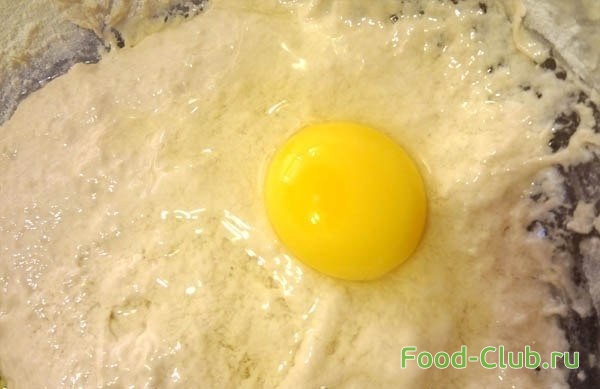 2. Высыпаем половину муки, размешиваем и добавляем яйцо, еще раз хорошо размешиваем массу.