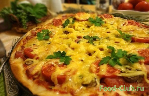 Восхитительная пицца на тонком тесте по традиционному итальянскому рецепту. Блюдо готовится в духовке 15-20 минут. Не передерживайте пиццу дольше, иначе тесто получится сухим и твердым.