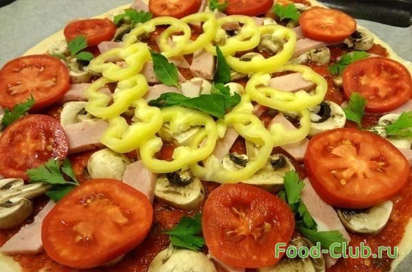 8. Выкладываем начинку слоями в следующей последовательности – грибы, ветчина, сладкий перец, помидоры посыпаем сверху сыром и зеленью.