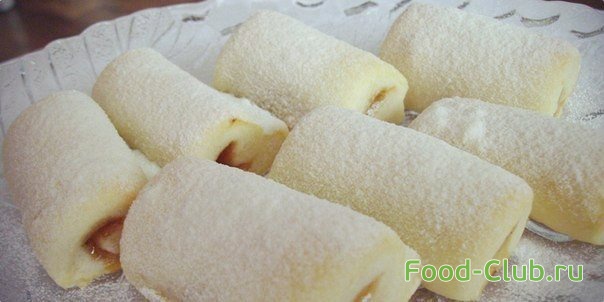 4. Разрежьте тесто на небольшие квадраты, смажьте начинкой и сверните в рулеты.