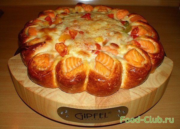 3. Оставшуюся рыбку нарежьте на кусочки и выложите в серединку. Томаты и перец нарежьте на кружочки и тоже выложите в центр круга. посолите и поперчите начинку, а сверху выложите кусочки моцареллы.