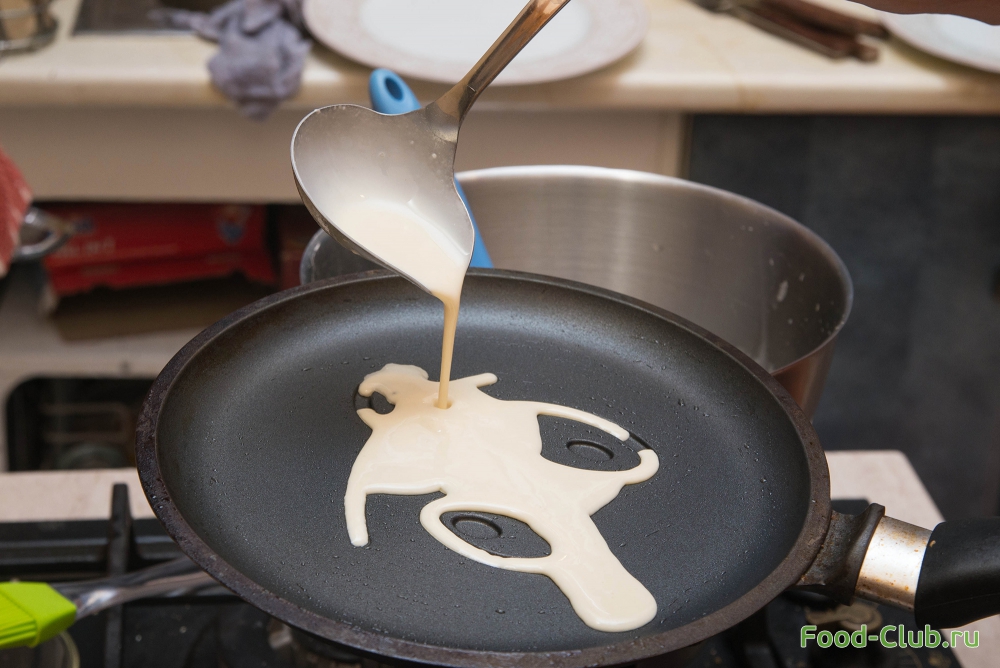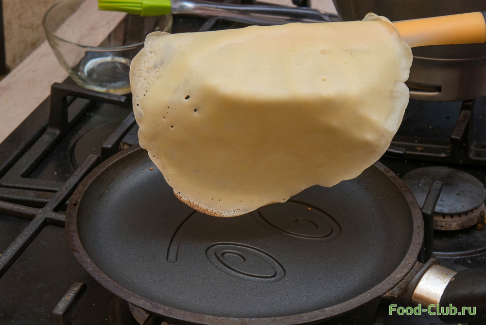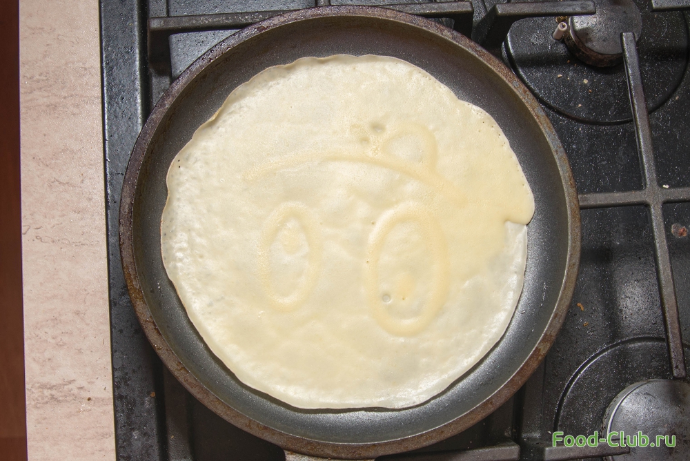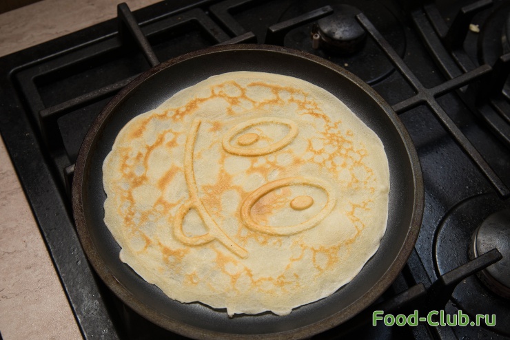 1. Сначала разогрейте сковороду. Лучше брать специальную блинную сковородку (не с высокими бортами). Смажьте слегка маслом (лучше это сделать специальной кисточкой). Налейте в середину сковороды тесто и распределите его по все поверхности.