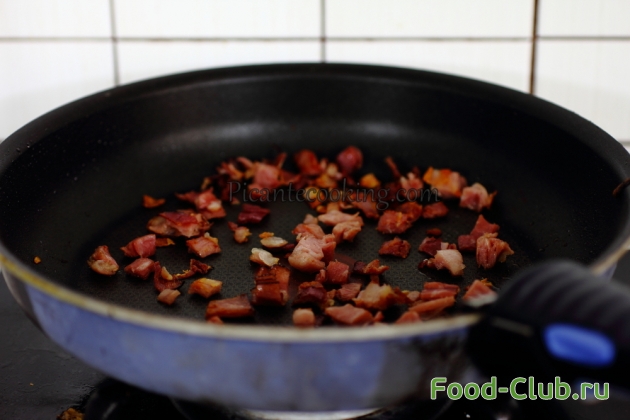 1. Для начала мелко нарежьте бекон (можно заменить копченной колбасой) и натрите сыр на терке. Разогрейте духовку до 180 градусов. Разогрейте сухую сковородку и обжарьте на ней бекон до хруста. Выложите на полотенце, чтобы стек жир. Тертый сыр смешайте с крахмалом.