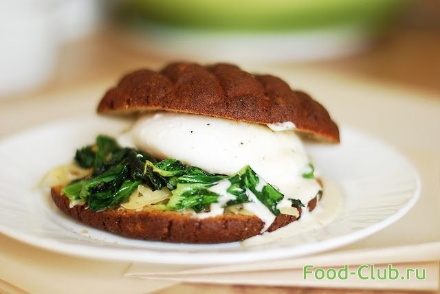 На бургер выложите шпинат, затем яйцо, посыпьте солью по вкусу. Для соуса смешиваем все ингредиенты и поливаем этой смесью яйцо в бургере. Посыпаем перцем и готово!