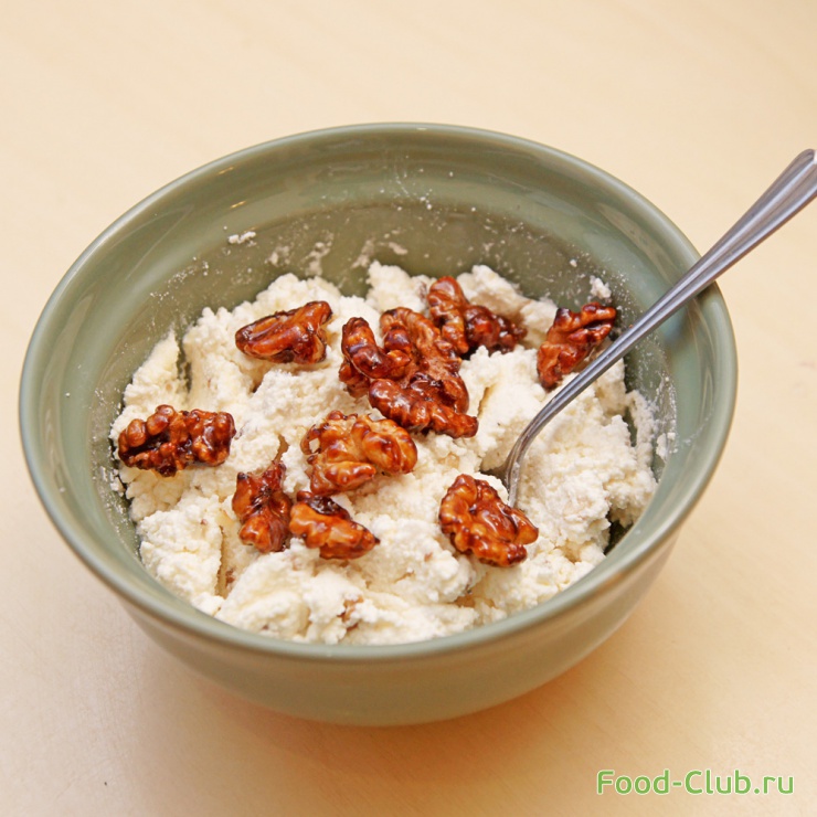 3. Творог смешайте с ряженкой или кефиром, хорошо перемешайте вилкой, слегка взбивая. Добавьте порубленные орехи, мед и перемешайте.