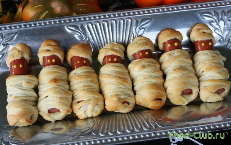 Описание приготовления:1. В первую очередь тонко раскатаем тесто (примерной толщиной в 0,7 мм) и нарезаем полосками шириной 1,5 — 2 см. Снимаем оболочку с сосисок. Заворачиваем сосиску в тесто «спиралью», делаем из теста с одной стороны сосиски нечто вроде «забинтованной головы мумии».