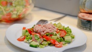 3. На блюдо поместите бортик для приготовления слоеных салатов и выложите слои в следующей очередности, смазав каждый майонезом: