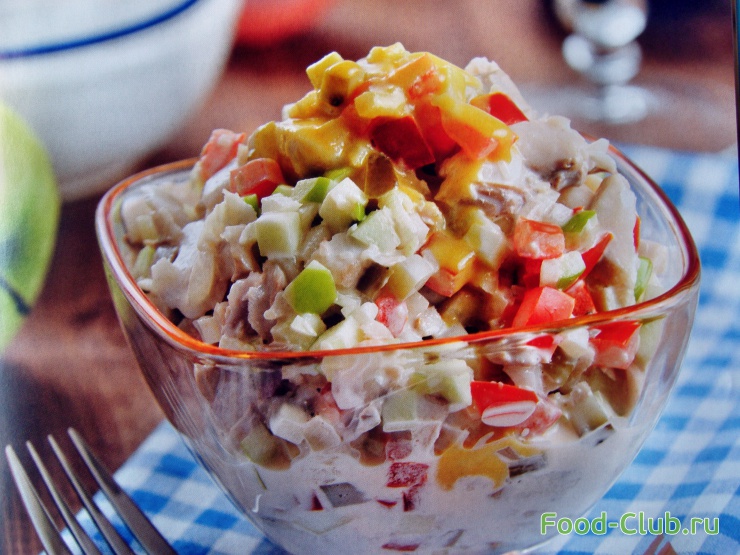 Перед тем, как подавать салат, 0- посолите. Я добавляю еще немного черного перца крупного помола. Майонез смешайте с ложечкой уксуса и заправьте салат.