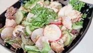 Когда будем подавать салат, -мелко режем сало (бекон, грудинку), вытапливаем его на сковородке. Мелко режем лук и добавляем в сковородку. Жарим до золотистого цвета. При подаче луковую зажарку кладем сверху на салат.