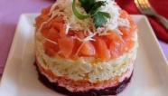 Откидываем картошку в дуршлаг и ждем, пока бульон полностью стечет. Берем большой салатник. Кладем картошку, яблоки, селедку и огурцы.