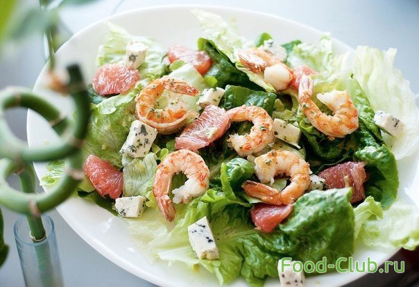 Промываем салат, немного его просушиваем и выкладываем на тарелку, поливаем половиной заправки. Сверху выкладываем остывшие креветки, дольки очищенного грейпфрута, и порезанный сыр. Поливаем блюдо оставшейся заправкой и подаем на стол.