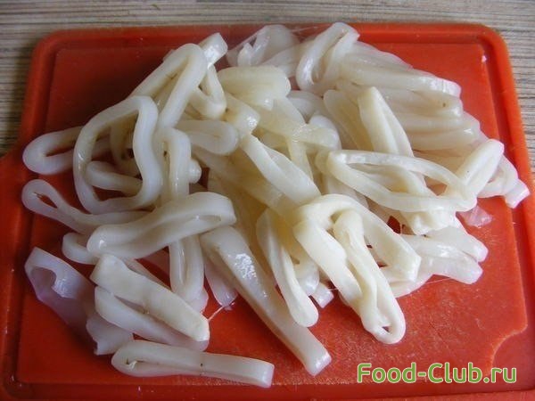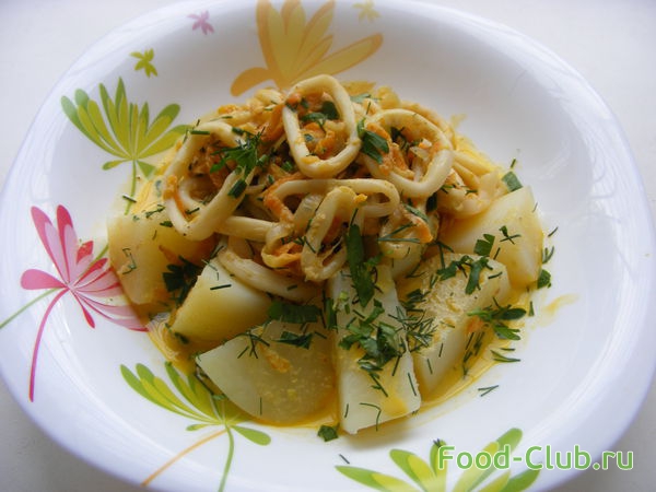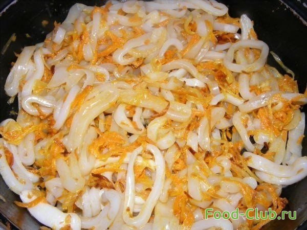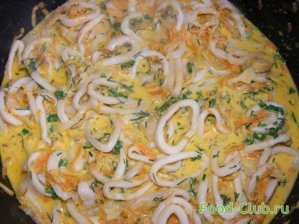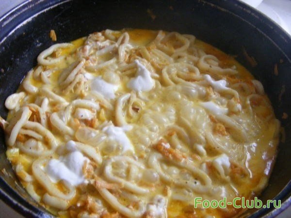 3. В практически готовые овощи выкладываем кальмары, солим, перчим, приправляем специи и добавляем сметану.