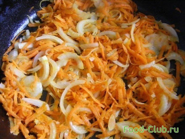 1. Натираем морковь на крупной терке, лук нарезаем полукольцами и обжариваем овощи на среднем огне, практически до готовности.