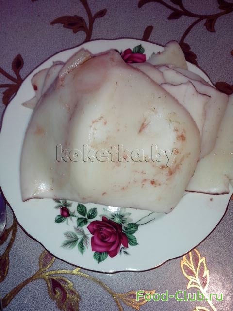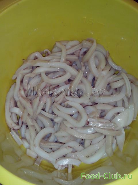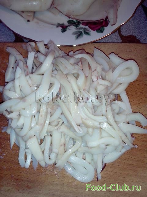 1. Кальмары хорошо промываем, отвариваем и удаляем хрящи и кожицу,