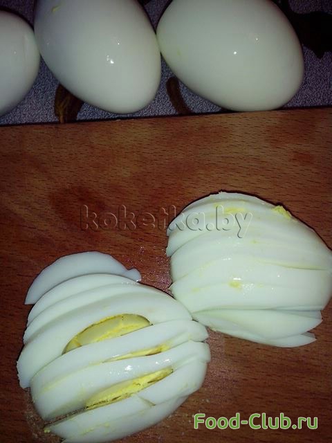 4. Яйца варим вкрутую, чистим и нарезаем полосками.