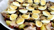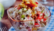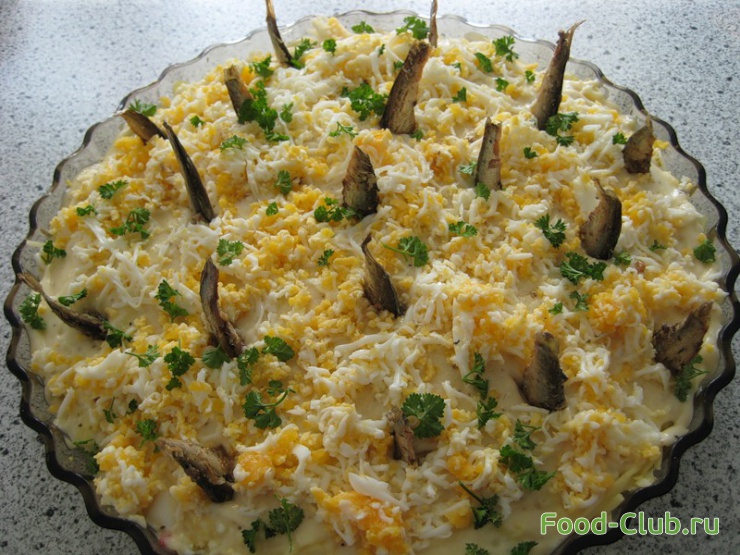 Последний слой смазываем майонезом, вставляем рыбьи хвостики и посыпаем зеленью. Для полной готовности необходимо поставить салат в холодильник.