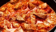 4. В это время параллельно готовим подливу, для этого пассируем на растительном масле измельченный лук и морковь, затем добавляем томатную пасту, чуть-чуть воды и соль по вкусу. Все хорошо перемешиваем и снимаем с огня. Заливаем картофель подливой и тушим под крышкой до полной готовности.