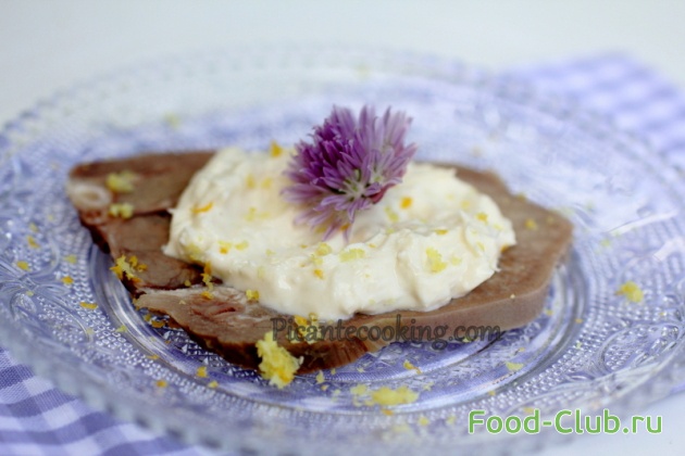 5. Язык нарезаем пластиками и подаем к столу вместе с соусом с хреном. Нежный, сочный язык с ярким, насыщенным мясным вкусом готов! Приятного вам аппетита!