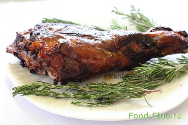 5. Смазываем ножку глазурью и ставим запекаться в предварительно разогретую духовку. Через 30 минут повторно смазываем ножку глазурью. Через 10 минут после начала запекания уменьшаем температуру в духовке до 160 градусов и выпекаем до готовности 70-90 минут. При прокалывании в самом толстом месте должен вытекает прозрачный сок.