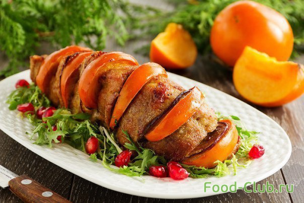 Мясо, приготовленное по этому рецепту, получается очень сочным и вкусным. Попробуйте, свинина, запеченная с хурмой, готовится элементарно!Мясо промоем, обсушим, потом хорошенько натрем перцем и солью, со всех сторон обжарим на оливковом маслице до румяности. Поперек мясного куска сделаем надрезы, до конца нож не доводим. Хурму режем колечками и вкладываем в разрезы на мясе. Туда же вложим по колечку лука.