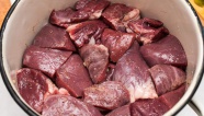 Свинину также режем тонко на полосочки, как на бефстроганов. Выложим на раскаленную сковороду с маслом.